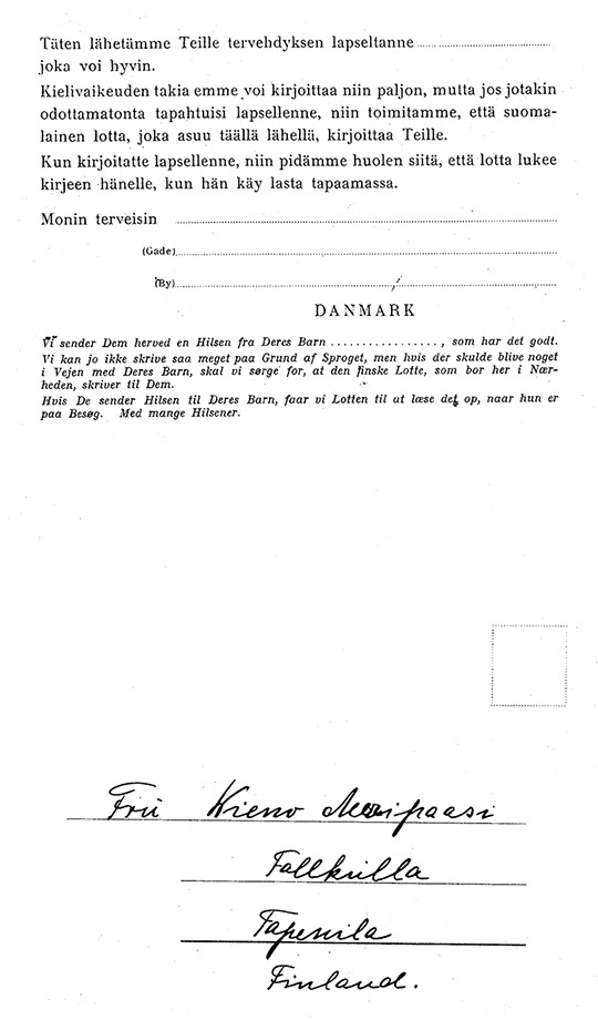 Helpottaakseen kanssakäymistä tanskalaisten sijaisvanhempien ja suomalaisvanhempien välillä oli olemassa ohjeita ja esitäytettyjä lomakkeita. Kirjeitä kirjoittaessa tuli esittää asiat lyhyesti, sillä kaikki kirjeet piti kääntää.